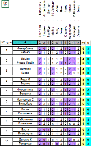 0 побед - две команды на типа "М": "Манчестер Сити" И.Ефимовича и Мадридский "Реал" В.Терехина. Испанцы в 4ом туре прервали свои поражения, сыграв в ничью дома на «Сантьяго Бернабеу» с итальянским "Торино" И.Песенко, а англичане продолжили коллекционировать поражения - Ливерпуль, Копенгаген, Саламанка, Витербезе.
