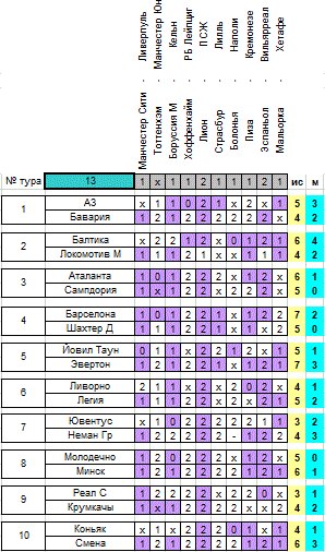 В следующем туре нас ждёт очная встреча лидирующего дуэта в Волковыске. Эвертон примет дома Коньяк, а Легия – Реал Сосьедад. Бавария едет в гости к Шахтёру, а Барселона наведается в Бергамо. Сампдорию ждёт домашнее дерби с Ювентусом, Неман примет АЗ, а Минск дома встретится с итальянскими «коммунистами». Локомотив попытается разжиться очками в домашнем матче с Молодечно, А Крумкачы примут Йовилл, которому уступают в таблице лишь по дополнительным показателям, являясь на текущий момент худшим прогнозистом дивизиона. До новых встреч! Удачи нам всем!!! Денис фартовый Астапенко