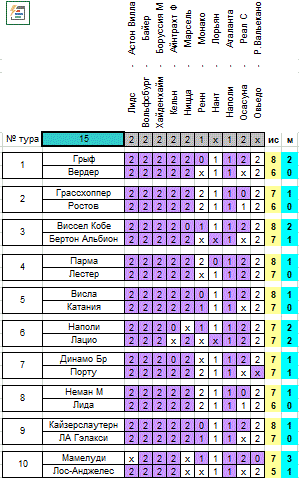 Пятую строчку делят Кайзерслаутерн и Виссел Кобе, демонстрирующие разную форму. Немцы, после серии ничьих, одержали таки победу, минимально одолев дома Гэлакси. Японцы же, после весьма неудачного старта сезона, одержали уже четвёртую победу подряд, в борьбе переиграв дома Бертон, от которого и оторвались в таблице, обогнав ещё и Лиду, прервавшую победную серию минимальным фиаско в Мостах. Бертон же не может выиграть на протяжении трёх матчей, опустившись на восьмую строчку, которую делит с Грыфом, наоборот, демонстрирующим длительную беспроигрышную серию, уверенно переиграв дома Вердер, опустившийся в зону стыковых матчей. Впрочем, тут всё очень условно, так как по очкам бременцы не уступают ни брестскому Динамо, ни Ростову, ни Лестеру, который с самым популярным счётом тура уступил в Парме, что позволило пармезанцам оторваться от «хитрого» соперника и компании. Мамелуди одержал волевую победу над Лос-Анджелесом, также оторвавшись от соперника, вплотную приблизившись к экватору таблицы, откуда не так уж далеко до пьедестала. Впрочем, зона вылета всё равно пока ближе, но это легко поправимо и можно успеть исправить ситуацию ещё в текущем календарном году. До новых встреч! Удачи нам всем!!! Денис фартовый Астапенко 24.11.2025