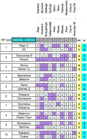 В прошлом туре лидирующую Баварию синхронно нагнали Йовил, Крумкачы и Неман, но в крайнем последний отстал от конкурентов, поделив на выезде очки в белорусском дерби с Минском. Остальная же троица праздновала дружные победы, продолжив делить лидерство, но уже на меньшее количество участников. Номинальным лидером остался представитель Британии, на выезде переигравший Ювентус. Бавария в родных стенах уверенно разобралась со Сменой, а Крумкачы вымучили минимальную викторию в домашнем матче с Аталантой.